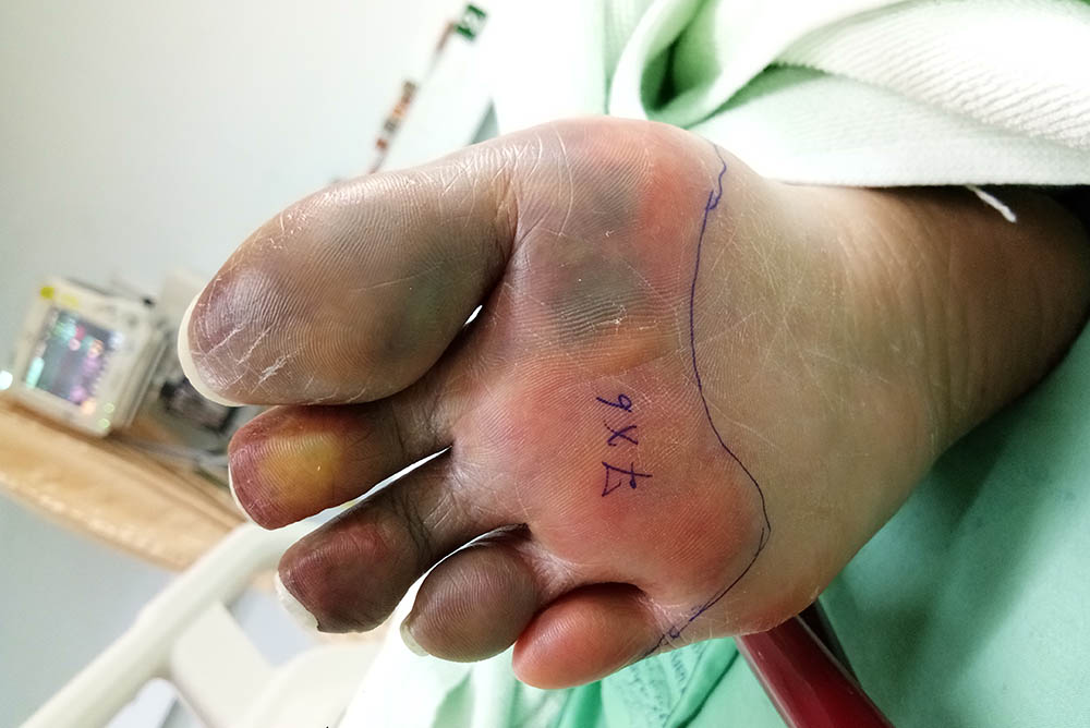 Dry gangrene is characterized by dry and shriveled skin. The affected areas can vary in color and usually appear brown, purple, blue, or black. Dry gangrene often develops slowly over a period of time.