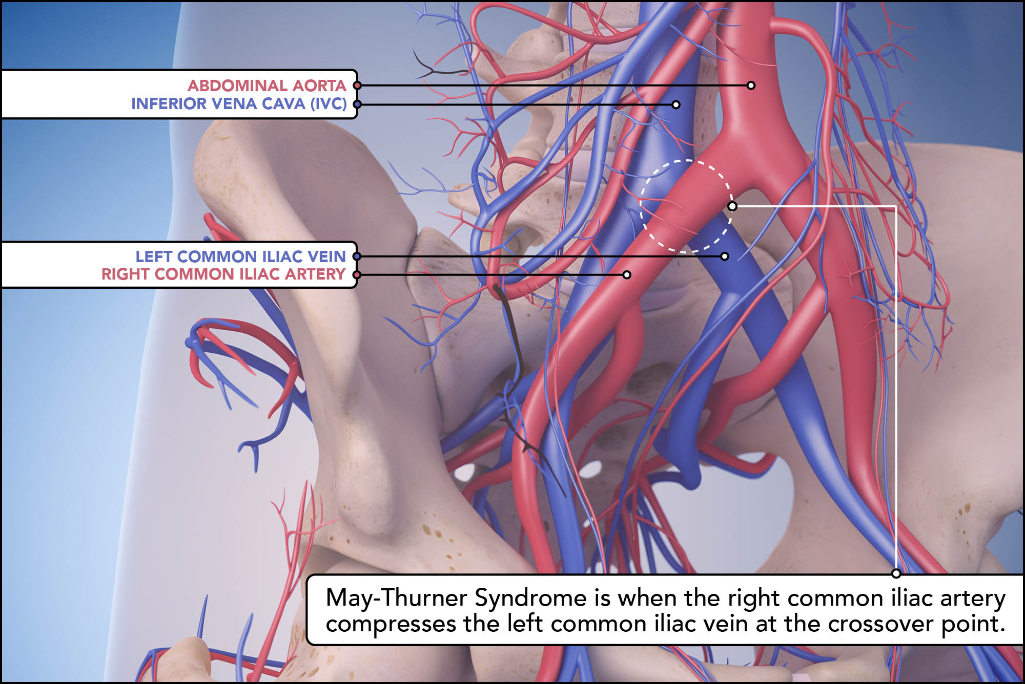May-Thurner syndrome happens when the right iliac artery puts pressure on the left iliac vein as they cross over each other inside the pelvis. The pressure restricts blood flow through the left iliac vein.  This is problematic for a number of reasons, and may lead to the development of a deep vein thrombosis (DVT) in the left leg. A DVT is a serious blood clot formation in the vein that restricts the flow of blood as it moves through the leg. This type of blood clot can break free and lodge itself in the lung, creating a potentially life-threatening pulmonary embolism.