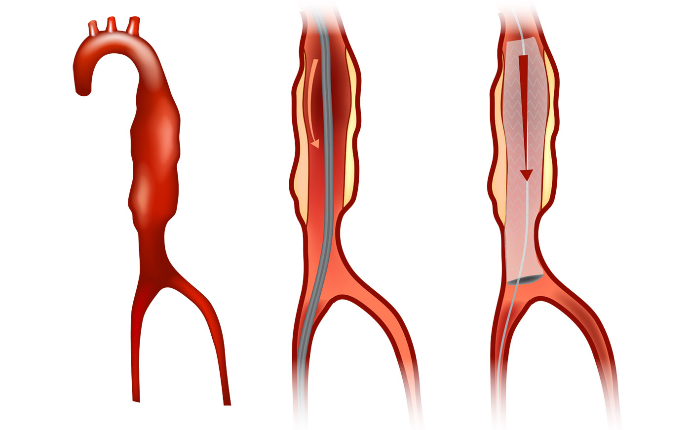 If your aneurysm is located below the arteries to the kidney, the standard method of repair involves inserting a catheter equipped with a stent graft into a groin artery access point and guiding it to the aneurysm site. Once positioned properly, a stent graft can be expanded within the artery to seal the stent graft in place and exclude the aneurysm. Once in place, blood will flow through the stent graft and will no longer enter the aneurysm.