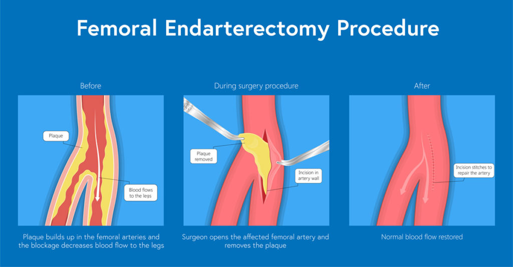 Accessing the femoral artery is achieved through an incision at the groin. Once exposed, the femoral artery is clamped on both sides to stop the flow of blood. Dr. Tahara then makes an incision in the artery, removes the plaque formation, and closes the artery.