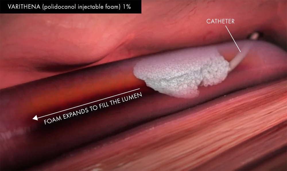 Varithena can be used to treat these malfunctioning superficial veins by injecting a sclerosant microfoam into them. With the non-functional veins sealed closed, blood is able to find other functional pathways up and out of the leg.