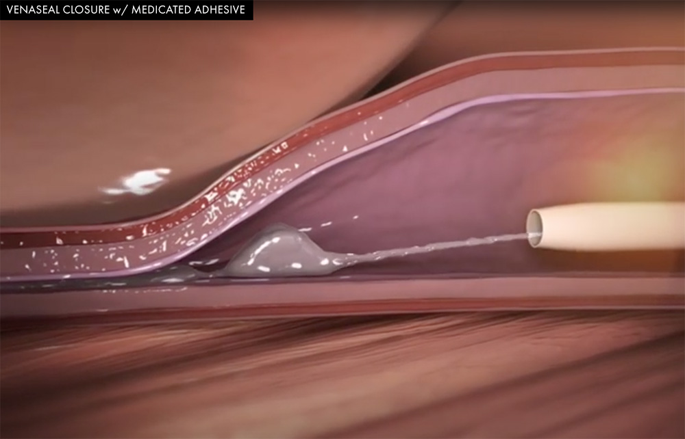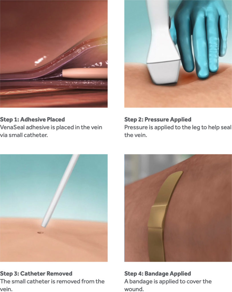 VenaSeal uses a type of vein “super glue” called cyanoacrylate – a clear liquid that is sterile and safe for intravenous use. VenaSeal differs from heat-based procedures such as radio frequency ablation therapy because no heat is delivered in the process. This eliminates the risk of burning the skin or causing heat-related nerve damage. With the non-functional veins sealed closed, blood is able to find other functional pathways up and out of the leg.